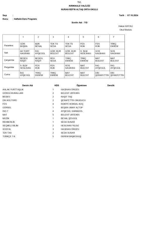 22.09.2025 tarihinden geçerli olmak üzere sınıflarımızın yeni ders programı.